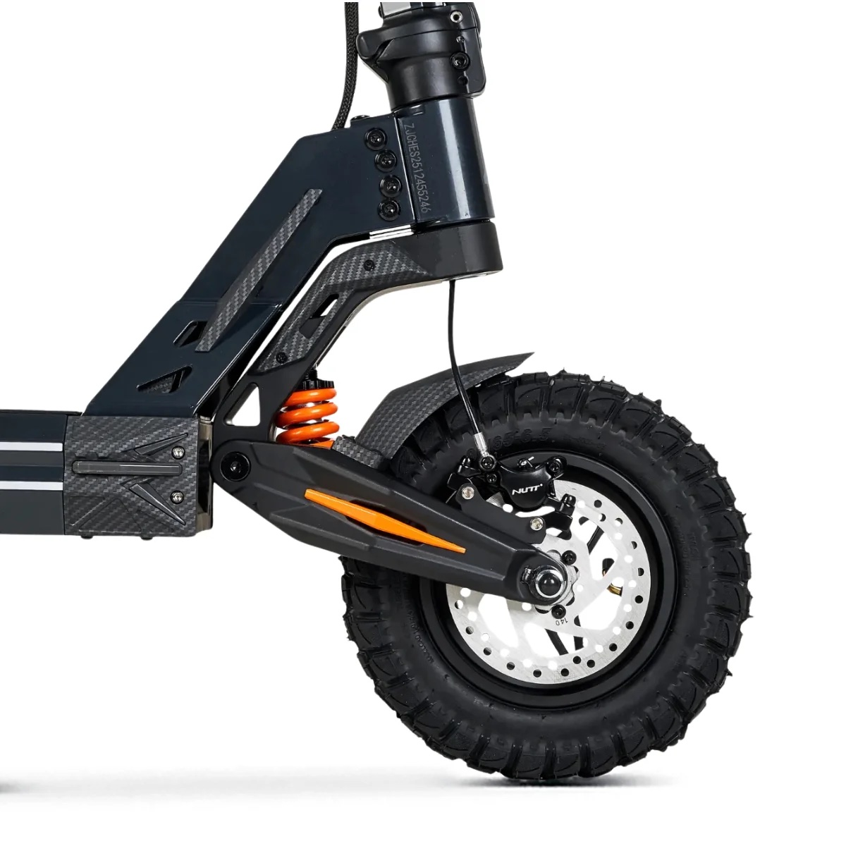 Patinete eléctrico de alto rendimiento con potencia de hasta 2000W, batería 48V 16Ah, autonomía de hasta 50 km y doble suspensión. Equipado con frenos hidráulicos NUTT y ruedas mixtas de 10”, ideal para uso urbano y terrenos exigentes